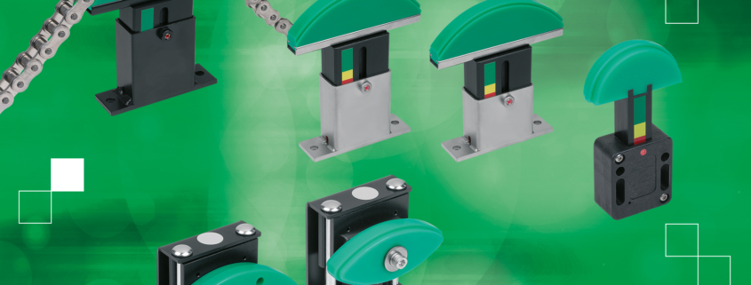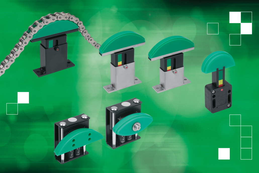 norelem láncfeszítői szabad futást biztosítva, rugósan működnek – így megelőzhető a túlzott felületi nyomás, miközben a lánc súlyából és a centrifugális erőből eredő teljes erő optimálisan szabályozható. A beszerelés egyszerű, és ideális esetben a meghajtó kerék mögött történik, hogy az üresjárat hossza a lehető legrövidebb legyen. A láncfeszítők házai műanyagból vagy acélból készülnek; a legigényesebb követelmények számára pedig rozsdamentes acél házak is választhatók. A csúszóprofilok ultranagy molekulatömegű PE-UHMW polietilénből készülnek.